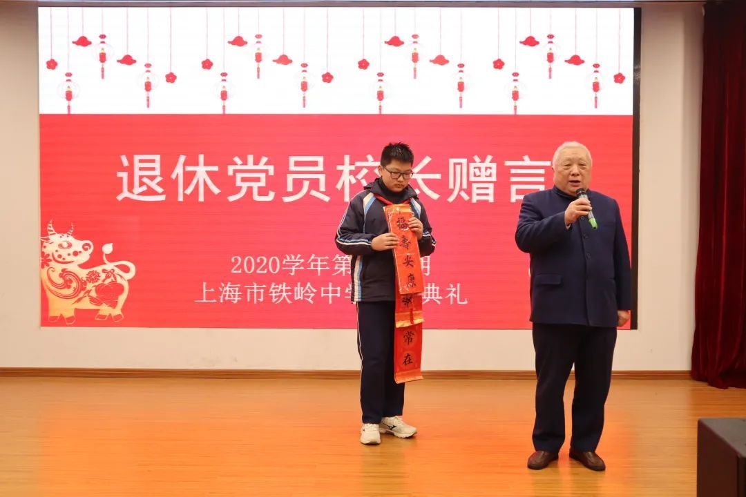 奏唱国歌之后,校长张贤臣总结了学校上一学期的成绩,号召大家继续发扬牛的“刻苦、踏实、坚韧”精神;老师向大家展示了寒假“新年春联秀”活动中的精彩作品,初一(4)班阮君昊同学将自己亲笔书写的对联赠送给退休党员校长吴永光。