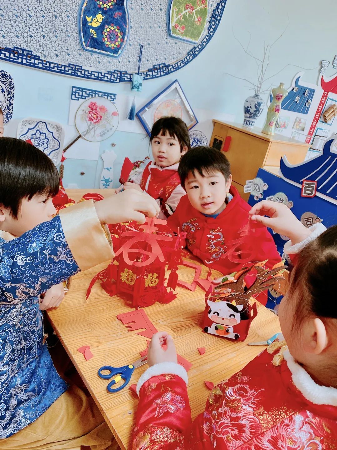 小班的宝宝们,在老师的指导下开心地“搓汤圆”、拍照片、尝美味,提前感受元宵节的滋味;中班的孩子则动手做起贺卡,将满满的心愿与祝福,融入diy的体验中;大班的小朋友在一起猜灯谜、开展茶话会、剪纸、“扭”汤圆……充满年味和趣味的活动,令小“神兽”们沉浸其中,度过快乐的开学第一天。