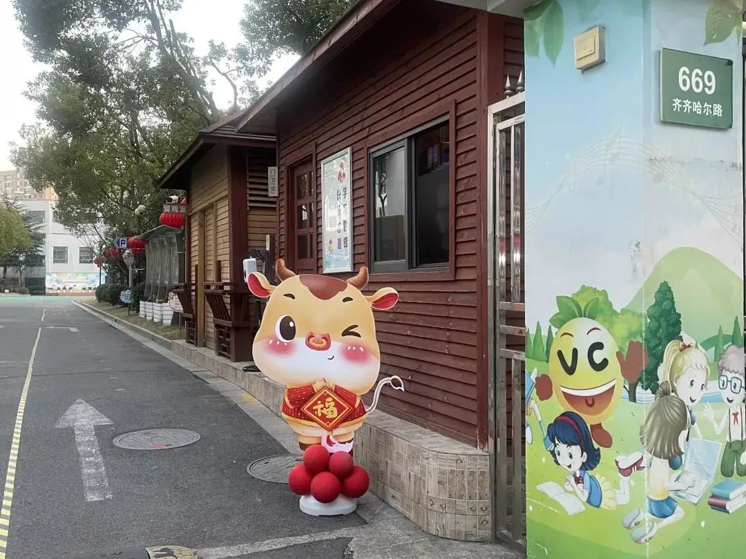 齐齐哈尔路第一小学的校门口,一只写着福字的卡通小牛,以作揖的动作欢迎每位走进校园的孩子。各年级进入校园采取错峰措施,五年级7:50进校;三、四年级8:00进校;一、二年级8:10进校。