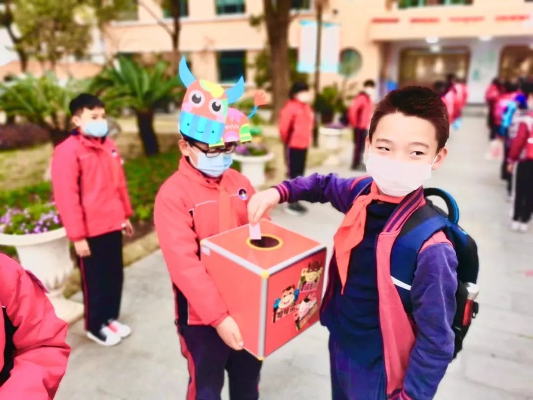 升旗仪式上,大队部发出了集五福的倡议,开学第一天,同学们就开始了为期一周的挑战:上课勤思考,积极举手回答问题;午餐不浪费,节约粮食力争光盘;强身健体,积极参与体育锻炼;勤劳小岗位,积极参与班内劳动……