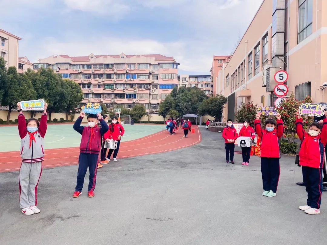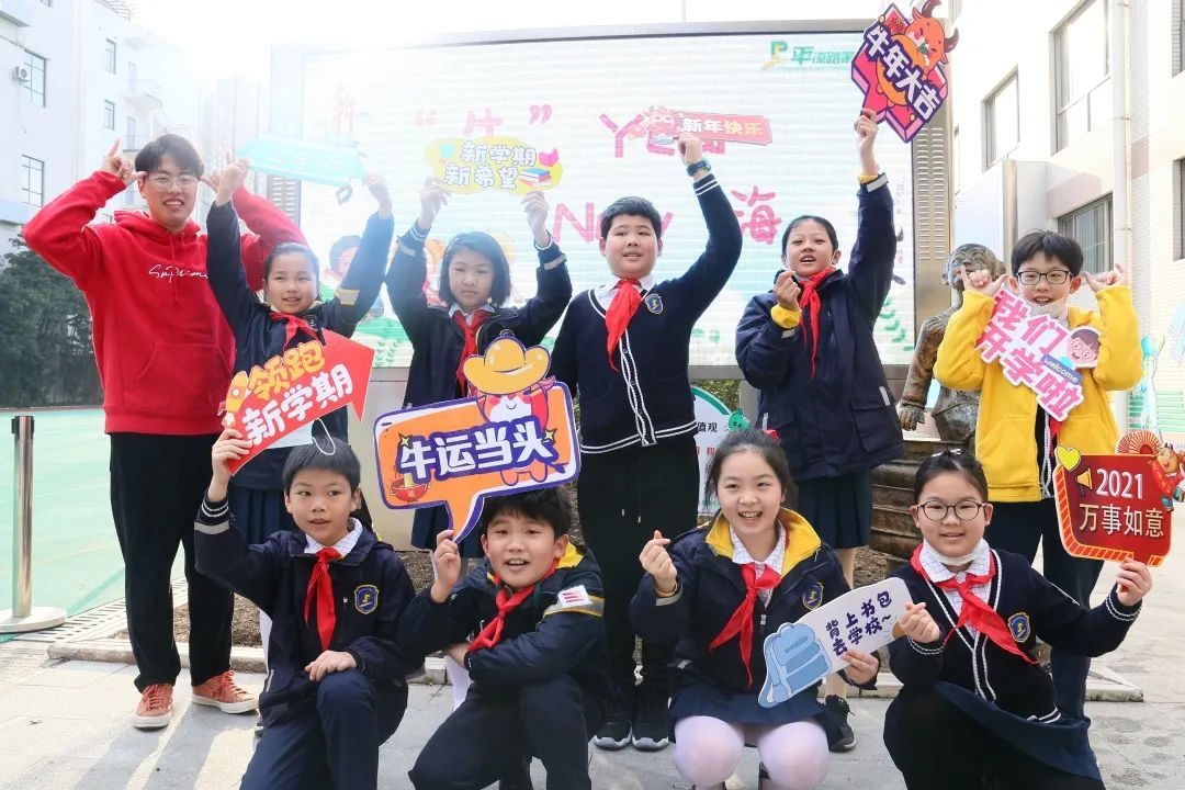 “牛年快乐!”在平凉路第三小学的校门口,大队委员们高举标语牌为同学们的开学“打call”,学校为大家送上“心愿胶囊”、新年手环与发箍。