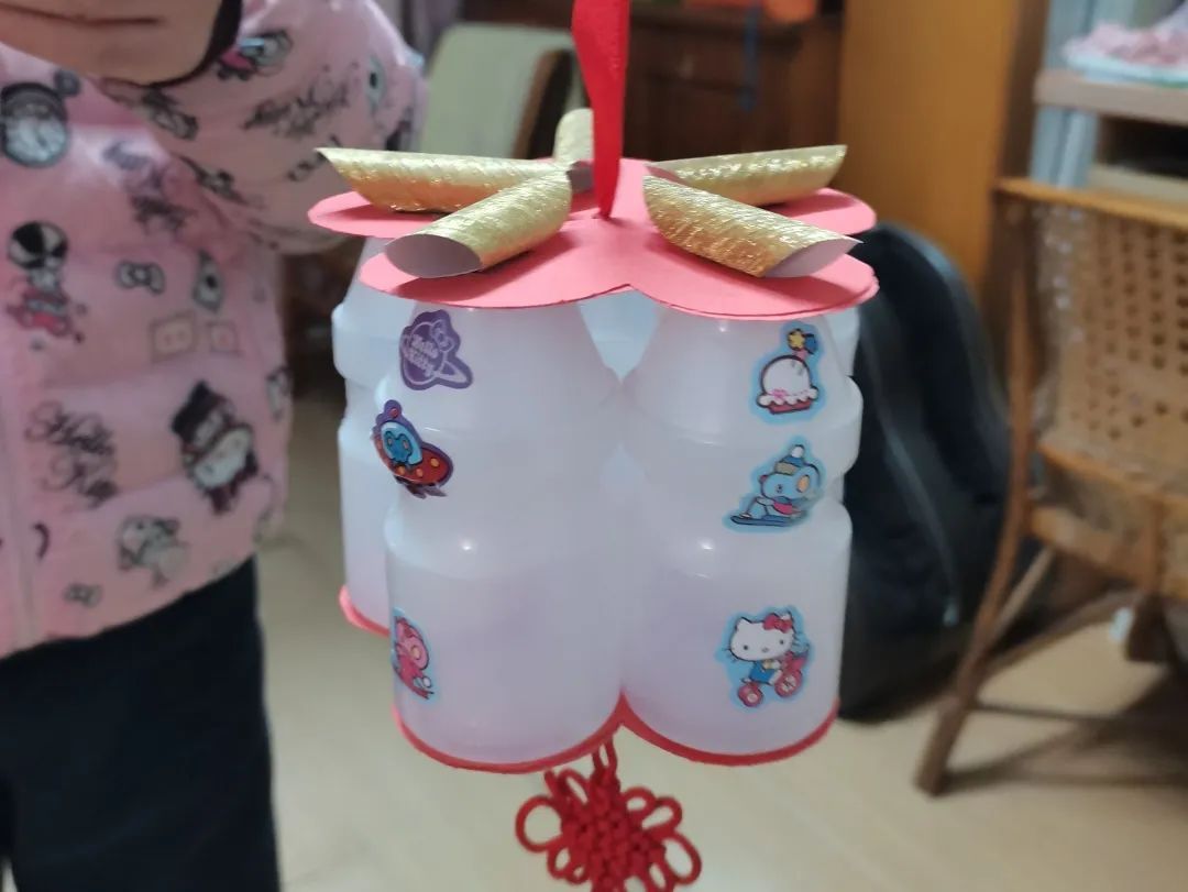 很多小朋友最爱的饮料之一养乐多,也能成为制作灯笼的材料。一位小朋友就用废弃的养乐多瓶子做了一个灯笼,瓶身贴上可爱的贴纸装饰,再用红色硬纸卡做一个灯笼盖,下边贴上中国结,用丝带穿起挂在一根塑料棒上,小小的灯笼就做成功了。这款灯笼用最简单的材料,做出真正的元宵佳节的灯笼。