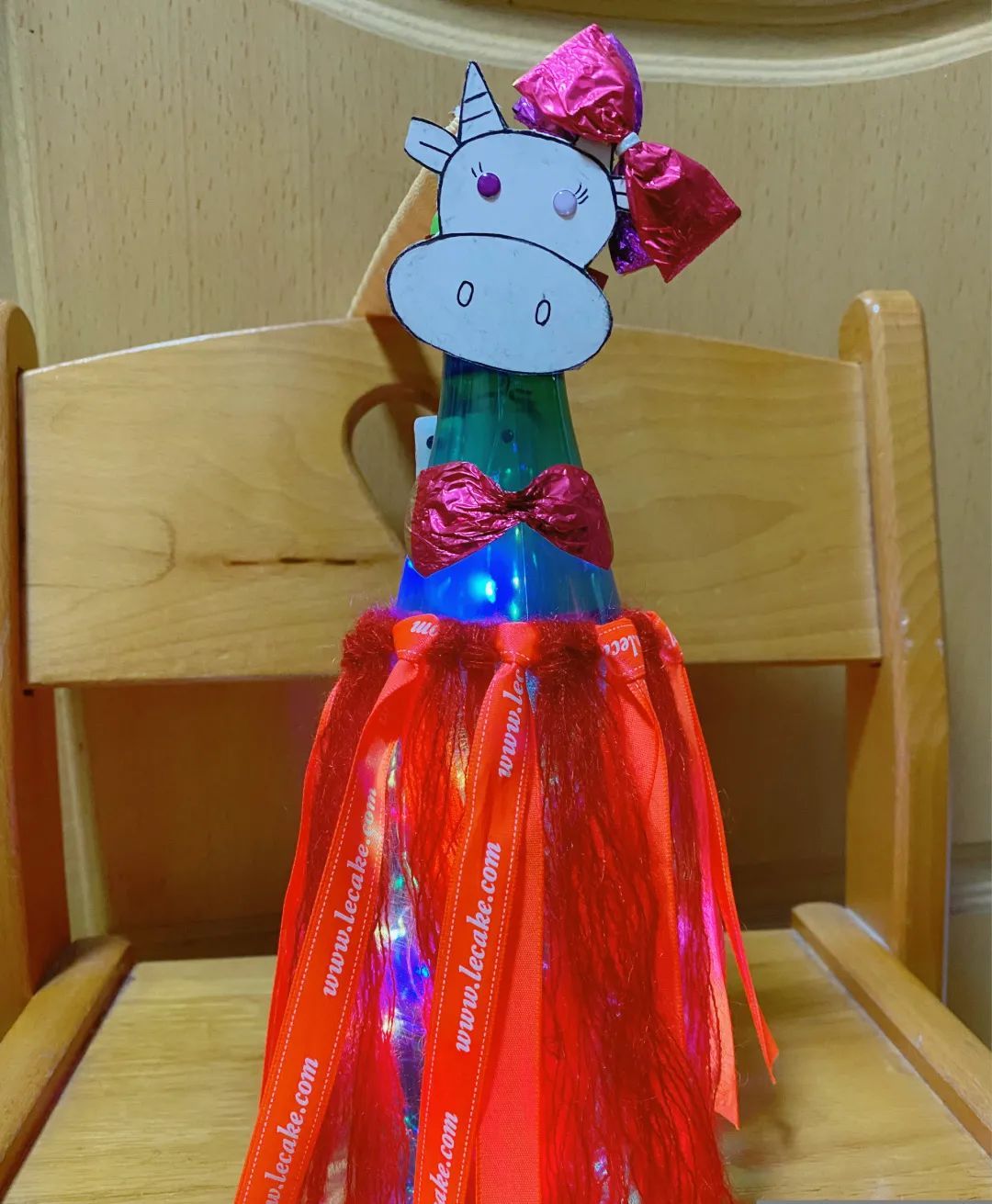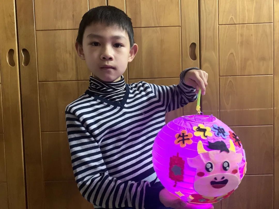 此次活动吸引了二十多位小朋友参赛,为了更贴近元宵节、环保的主题,制作灯笼的材料多是使用过的,颜色方面选用了传统灯笼的红色。而为了让孩子乐于动手参与其中,有的加入了动漫元素,使灯笼充满喜庆又富有童趣。比如这个卡通牛灯笼,可爱的简笔画画出牛头,红色丝带做裙子,还系上漂亮的粉色蝴蝶结,寓意牛年快乐,体现出孩子不浪费、珍惜环保的精神。