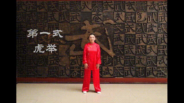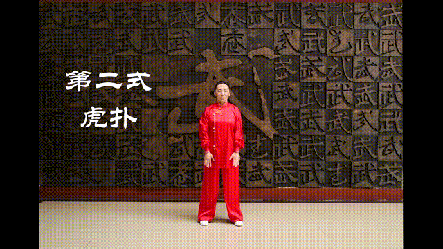 1.做法:手握空拳,提至肩前继而向上、向前划弧,十指弯曲成“虎爪”,掌心向下;同时上身前俯,挺胸塌腰,怒视前方。屈膝下蹲,收腹含胸,两手向下划弧至膝侧,掌心向下;随后伸膝,送髋,挺腹,挺胸;同时手握空拳,提至胸侧,目视前上方;右脚尖顺势外展约30度;左腿屈膝提起,两手上举。左脚向前迈出一步,脚跟着地,右腿屈膝下蹲,成左虚步;同时上体前倾,两拳变“虎爪”向前、向下扑至膝前两侧,掌心向下。上体抬起,左脚收回,开步站立,两手自然下落。动作相同方向相反,重复一遍。