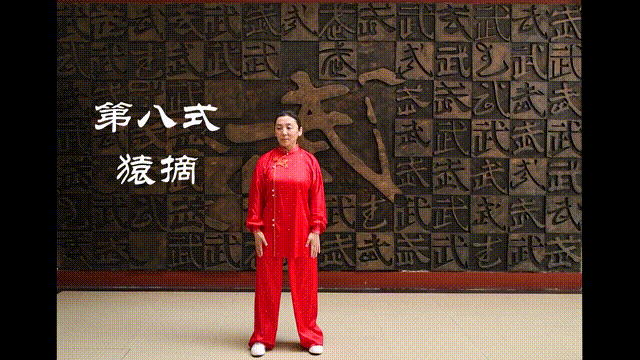 1.做法:左脚向左后方退步,脚尖点地,右腿屈膝;同时左臂屈肘,左掌成“猿钩”收至左腰侧,右掌向右前方摆起,掌心向下。重心后移,左脚踏实,屈膝下蹲,右脚收至左脚内侧,脚尖点地,成右丁步;同时右掌经腹前向左上划弧至头左侧,掌心对太阳穴;右掌内旋,掌心向下按至左髋侧。右脚向右前方迈一大步,左腿蹬伸,重心前移;右腿伸直,左脚尖点地;同时右掌经体前向右上划弧至稍高于肩处变“猿钩”;左掌向前、向上伸举,屈腕撮钩,成采摘式。重心后移,左掌变为“握固”;右手变掌回落于体前,虎口朝前。左腿屈膝下蹲,做右丁步;左臂屈肘收至左前方,掌指分开,掌心朝上,虎口朝左后方,成托桃状;右掌经体前向左划弧至左肘下捧托。动作相同方向相反重复一遍后,左脚开步直立,两臂自然垂于体侧。
