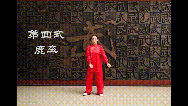 1.做法:左脚前跨一步,屈膝,右腿伸直成左弓步;同时手握空拳,向上、向前划弧至与肩同高,屈腕,与肩同宽,拳心向下。重心后移,左膝伸直,全脚掌落地;右腿屈膝,低头,弓背,收腹;同时两臂内旋,两掌前伸,掌背相对,拳变“鹿角”。重心前移,上体抬起,左弓步,两臂外旋,“鹿角”变空拳,与肩同高,拳心向下。左脚收回,脚尖点地。左脚脚后跟落地,同时右脚脚后跟抬起两脚换跳步,两拳随之向下划弧落于体侧,换跳完成后,重复动作一遍。动作相同,方向相反。之后,右脚收回,开步站立,两臂垂于体侧 。