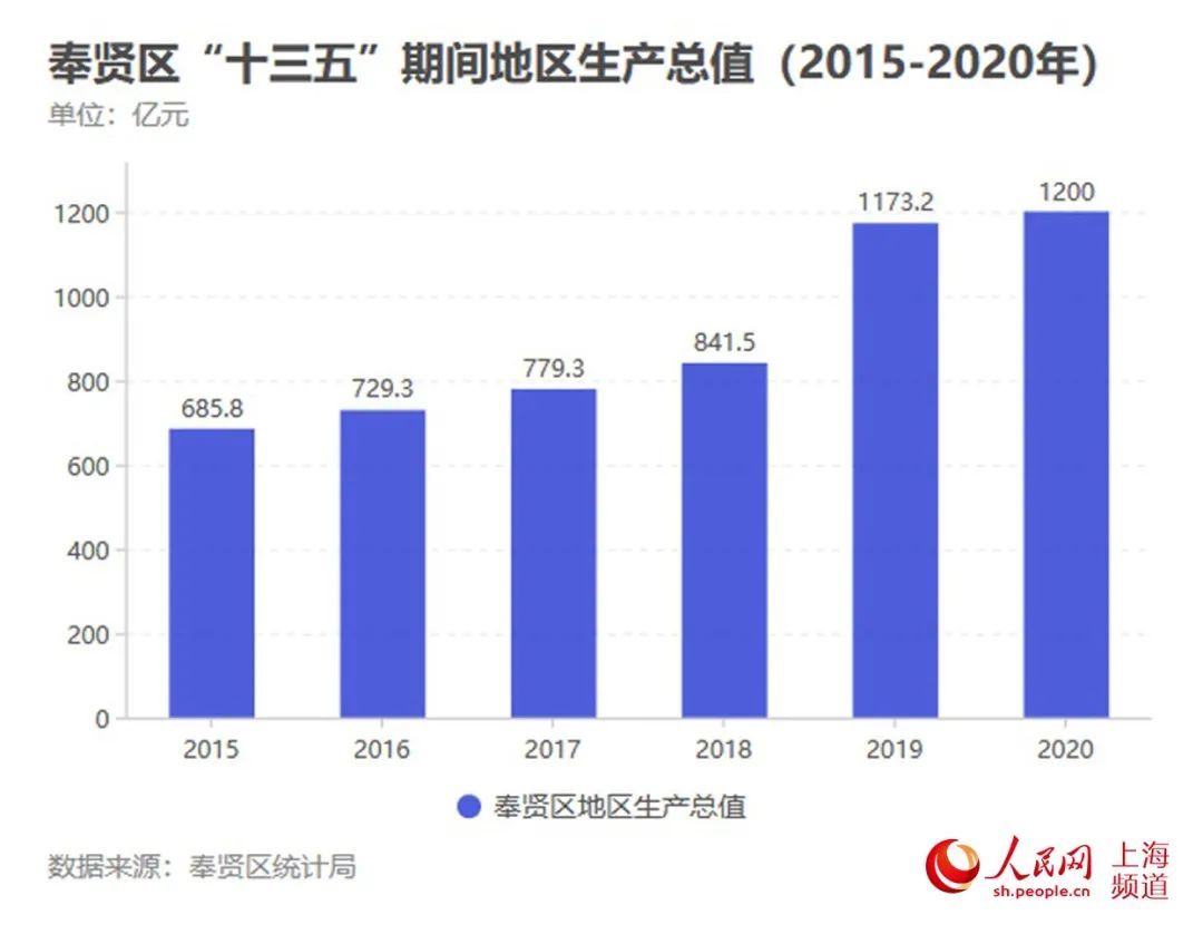 2020年,面对新冠肺炎疫情冲击,奉贤区预计实现地区生产总值1200亿元。此外,根据历年数据测算,“十三五”期间,奉贤地区生产总值增幅达到64.54%。