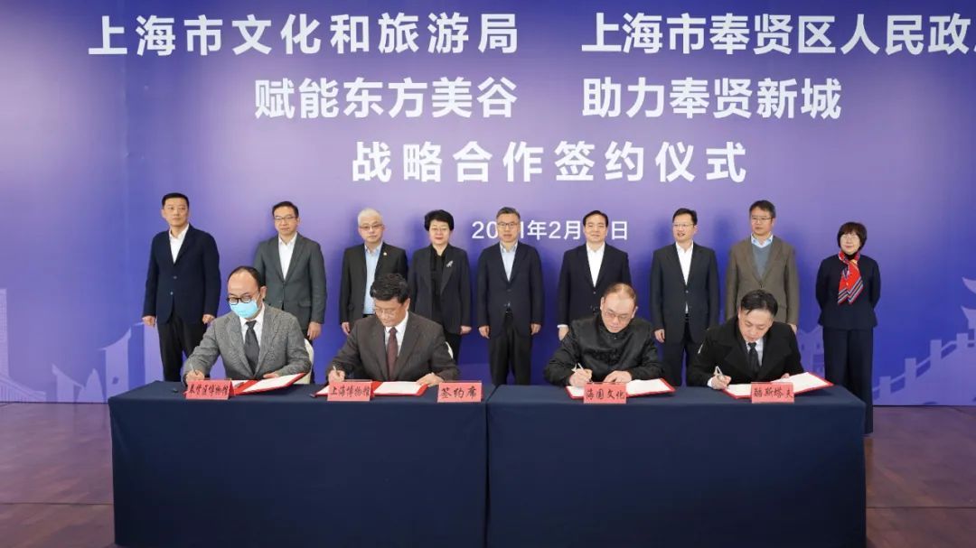 2月10日上午,上海市文化和旅游局、奉贤区人民政府《“赋能东方美谷、助力奉贤新城”战略合作框架协议》签约仪式在奉贤区博物馆举行,双方就文旅地标打造、文旅品牌提升、文旅产业建设、公共文化供给等,达成全方位全要素合作意向,助力奉贤新城建设发展。