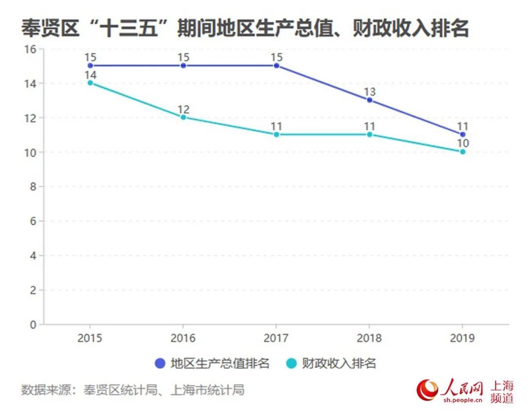 “十三五”时期,奉贤区经济数据排名一路上扬。2019年,奉贤区地区生产总值排名为第11位,财政收入达到第10位。