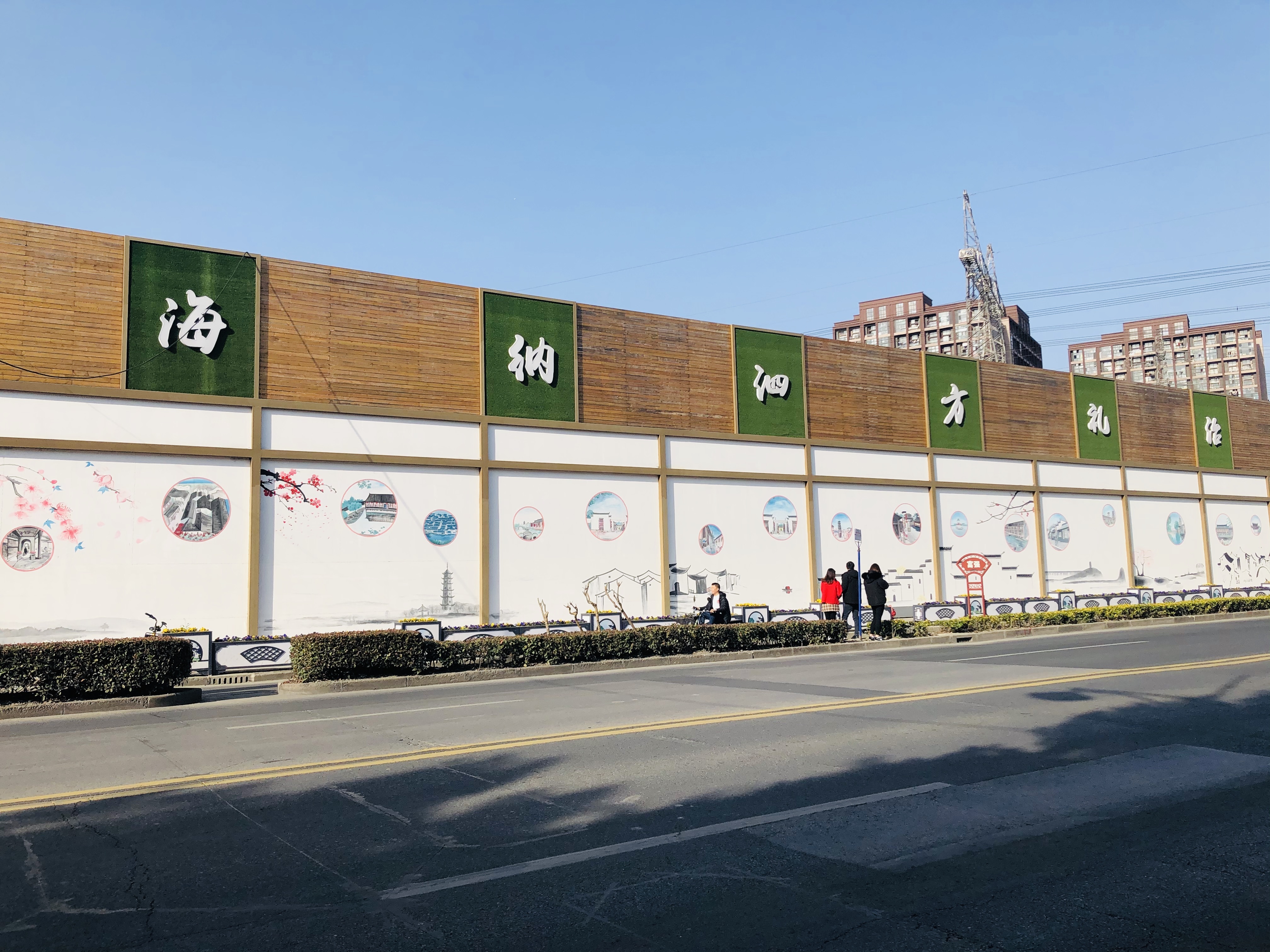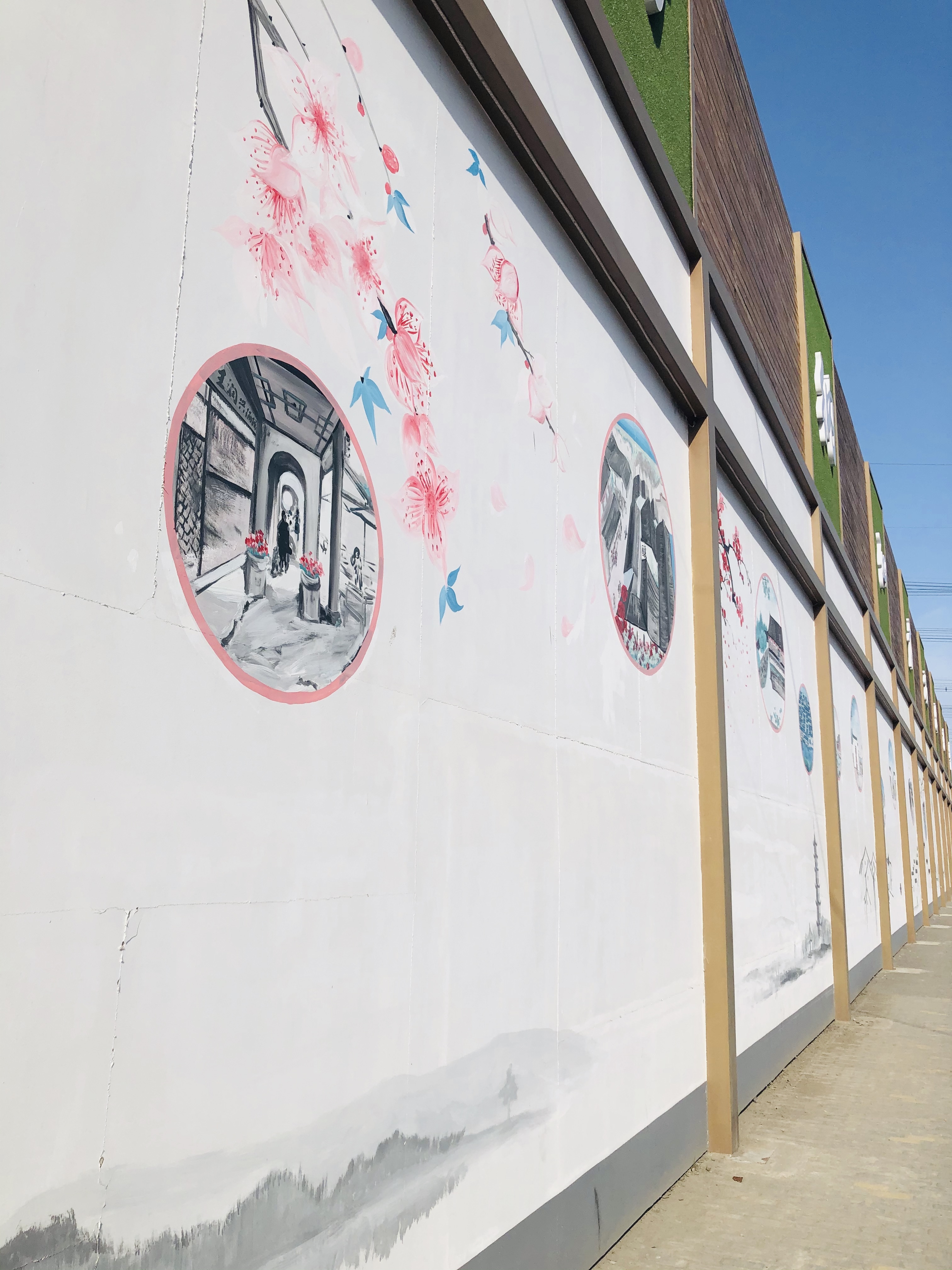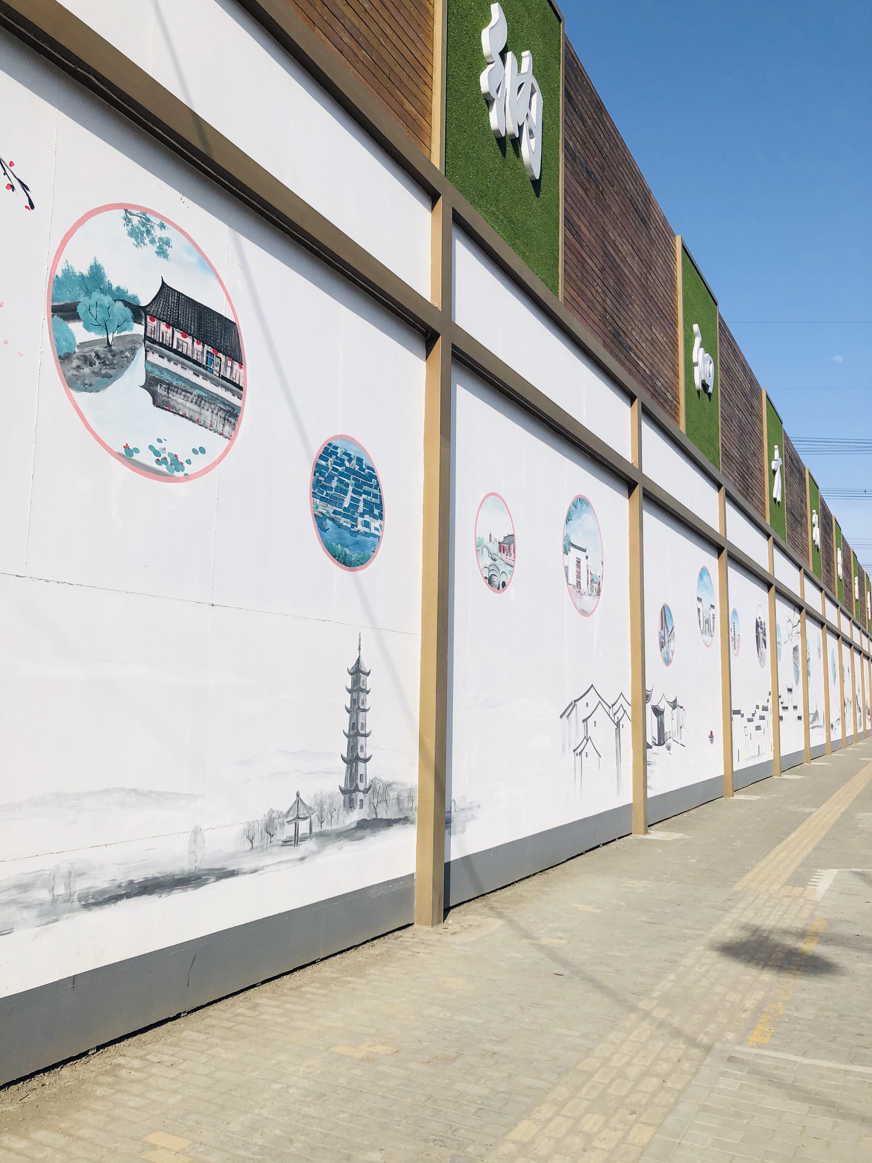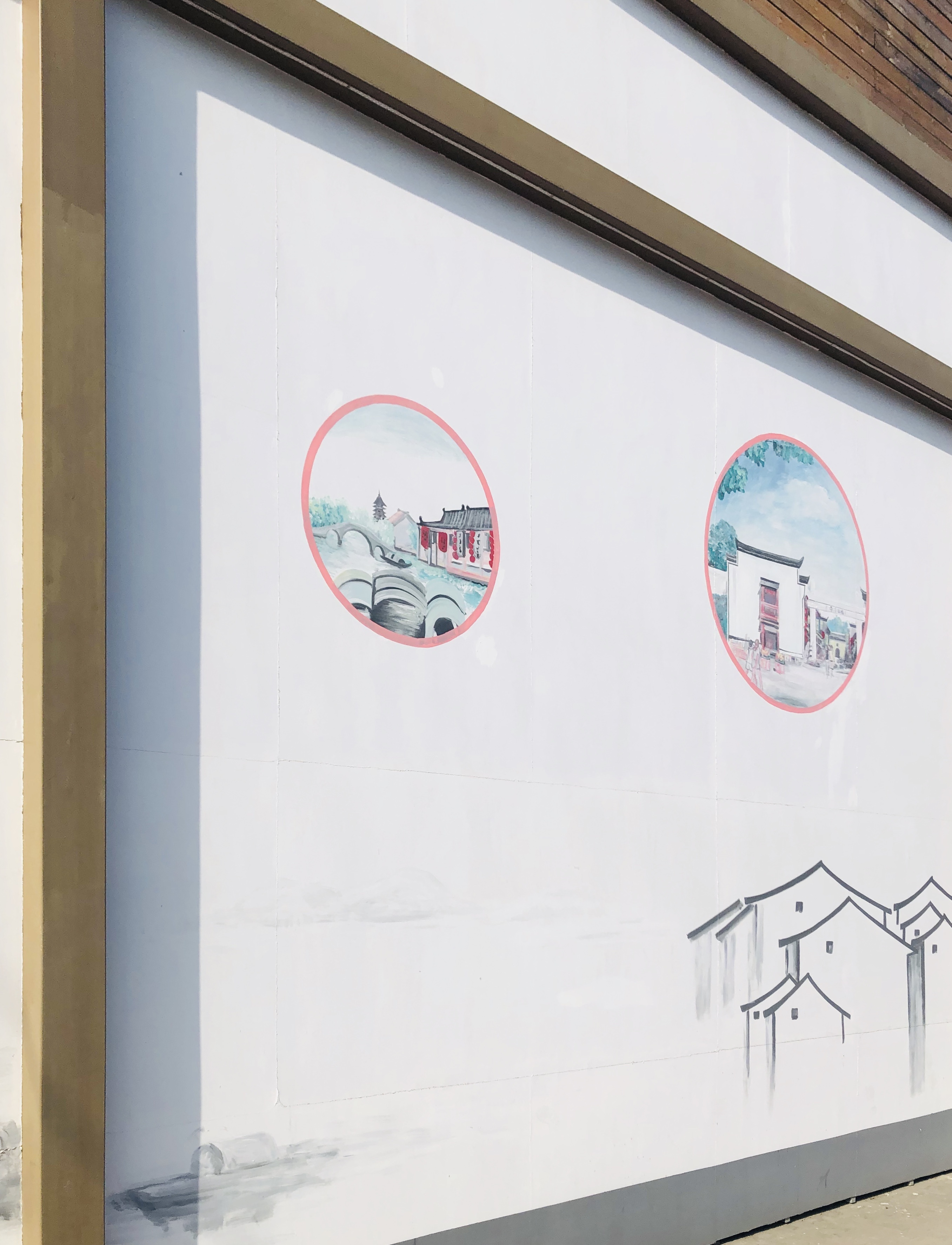 围墙整体靠上部分采用了原木色竹扁的底板,附上了“海纳泗方,礼治泾纬”8个绿底白字的街区标语,传达出了泗泾礼治建设的理念。围墙往下部分,设计者描绘了一幅幅古色古香、典雅秀丽的泗泾古镇建筑画,文艺范十足。设计者表示,希望能以这面墙为“窗口”,将泗泾镇的人文历史展现给当地居民和途经泗泾的每一位匆匆过客。道路与白墙早已不仅仅是简单地连接着东西南北,它们一头连着过去,一头指向未来,是一种指引和归属;它们也是泗泾镇推进“美丽街区”、建设人民城市的缩影。