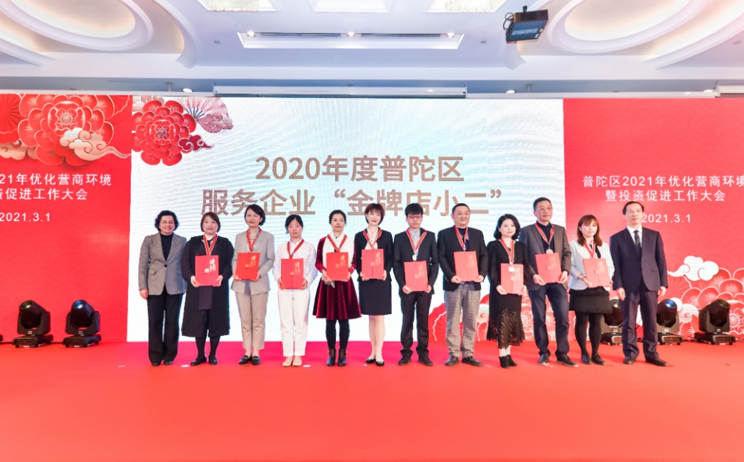 颁发“2020年度普陀区服务企业‘金牌店小二’”奖牌和证书