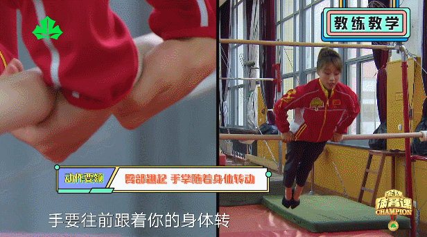 杠上运动主要用到运动员的核心力量。撑上单杠之后,要保持臀部翘起,不能挂在下面。