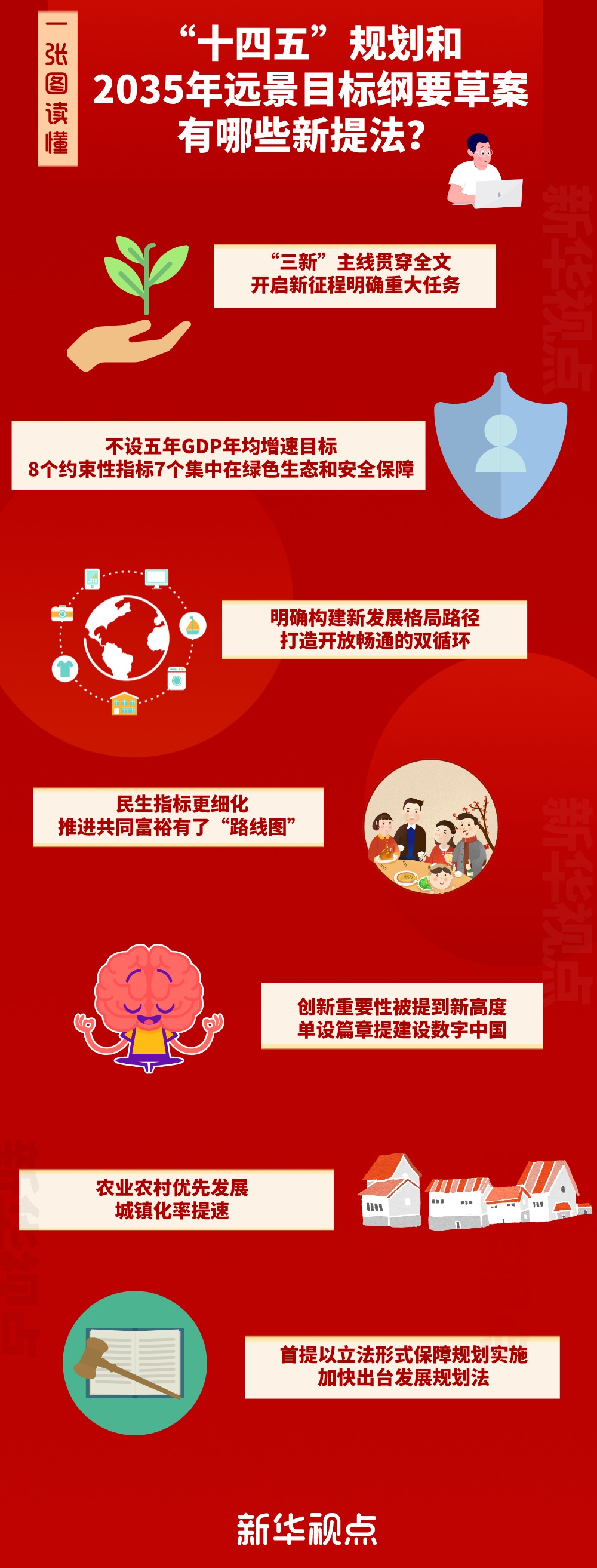 3月5日,备受关注的“十四五”规划和2035年远景目标纲要草案提请十三届全国人大四次会议审查。超过7万字、厚达142页的草案文本中有哪些新提法、新部署、新指标?“新华视点”记者采访了部分代表委员和权威人士。