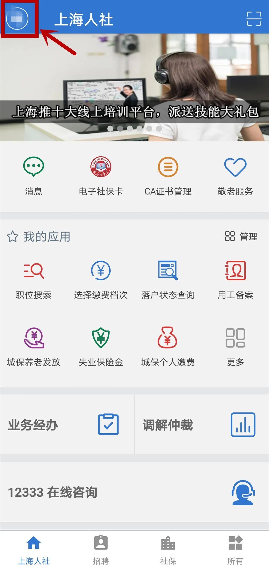 02、打开app,点击首页左上角圆形图标注册/登录人社账号。