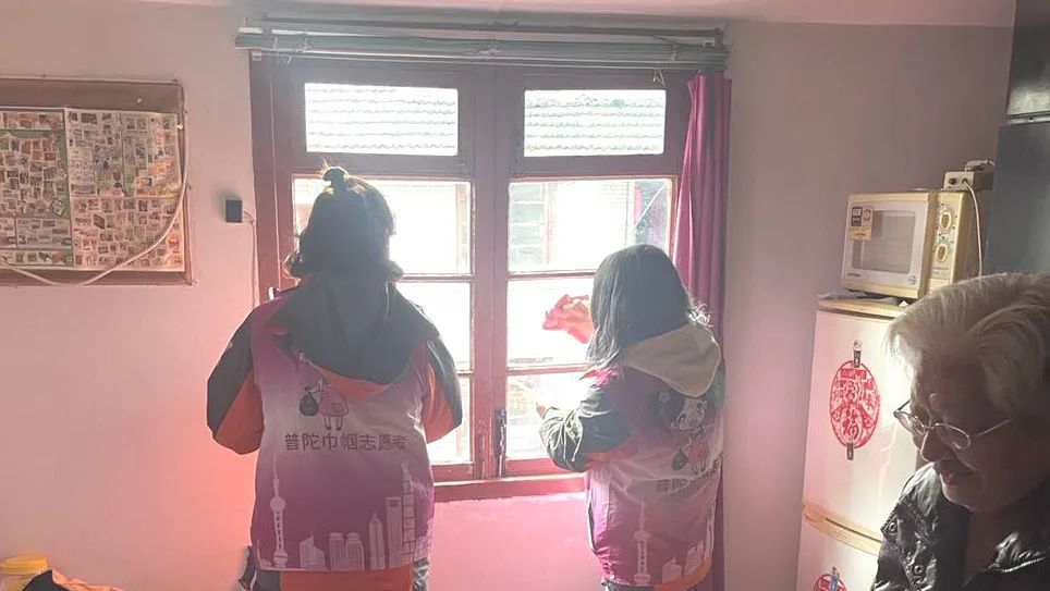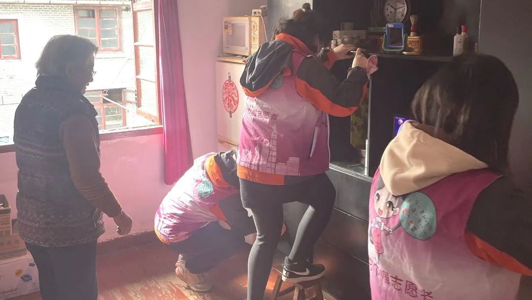 志愿者们一进门就拿起抹布开始打扫,把卫生死角以及平时难以清洁的地方打扫得干干净净,完工后大家又围着陈老师聊起了家常。