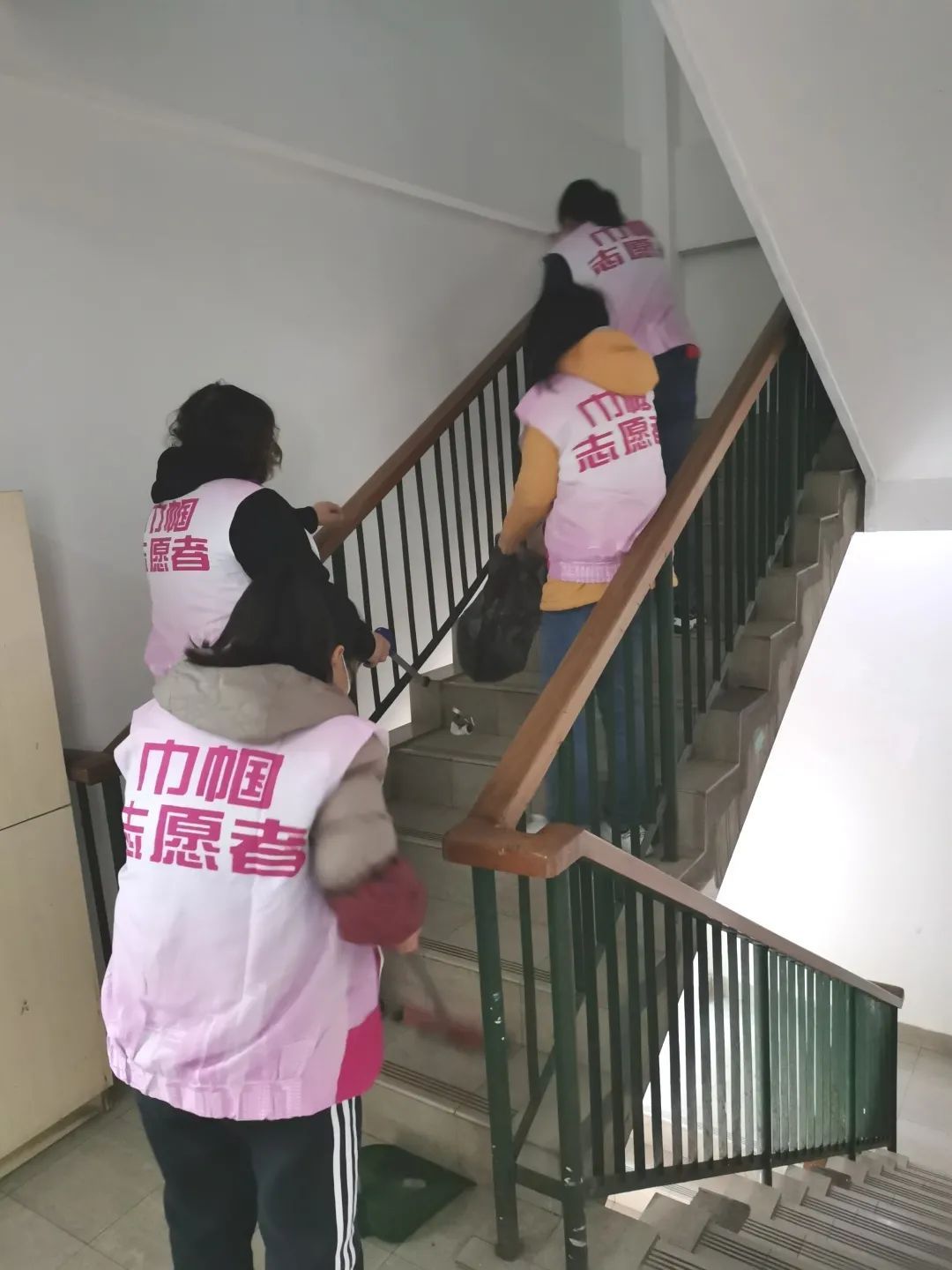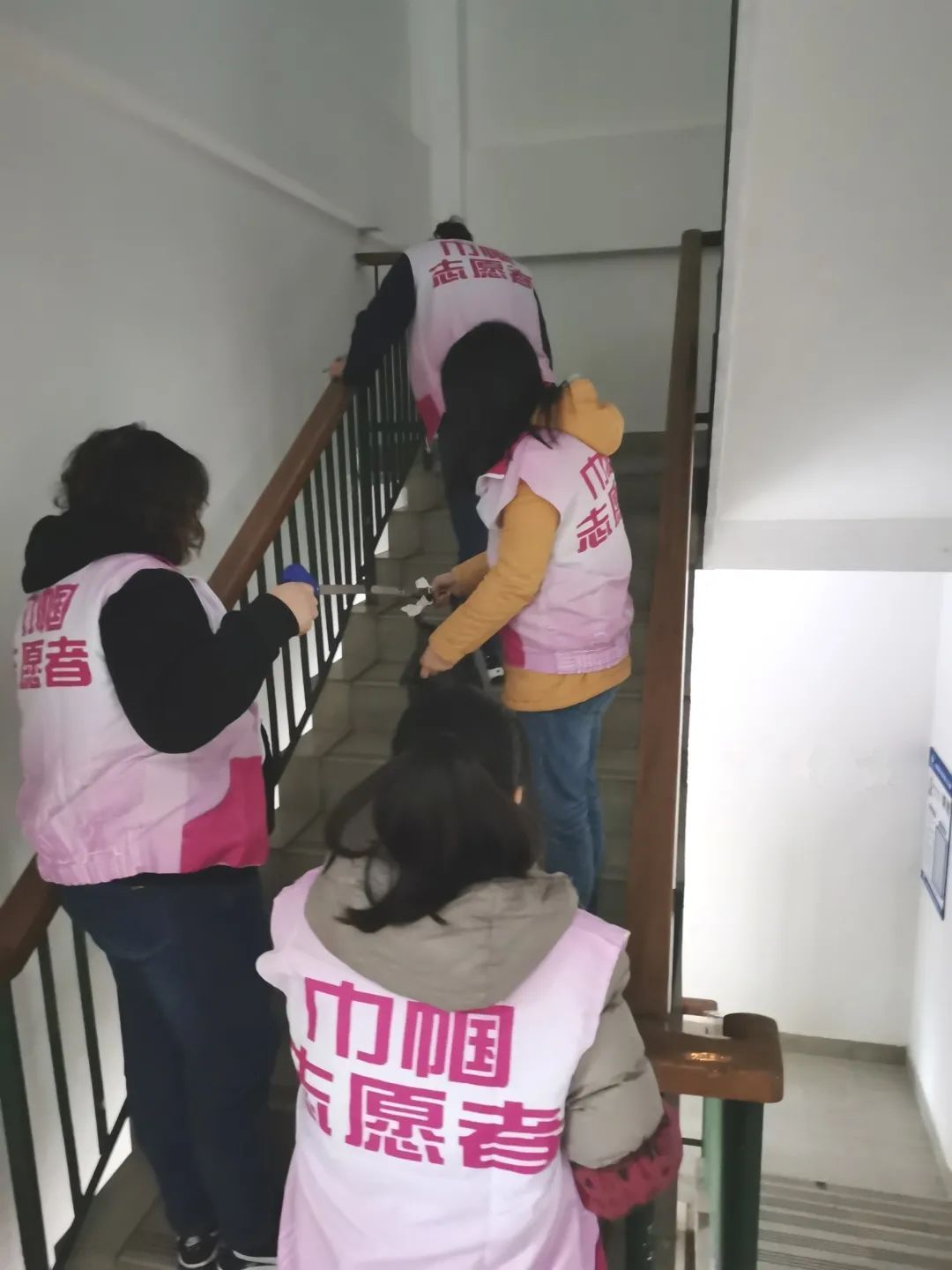 大家把一到六楼的楼道打扫整理得干干净净,让居民过上一个舒心的三八妇女节。