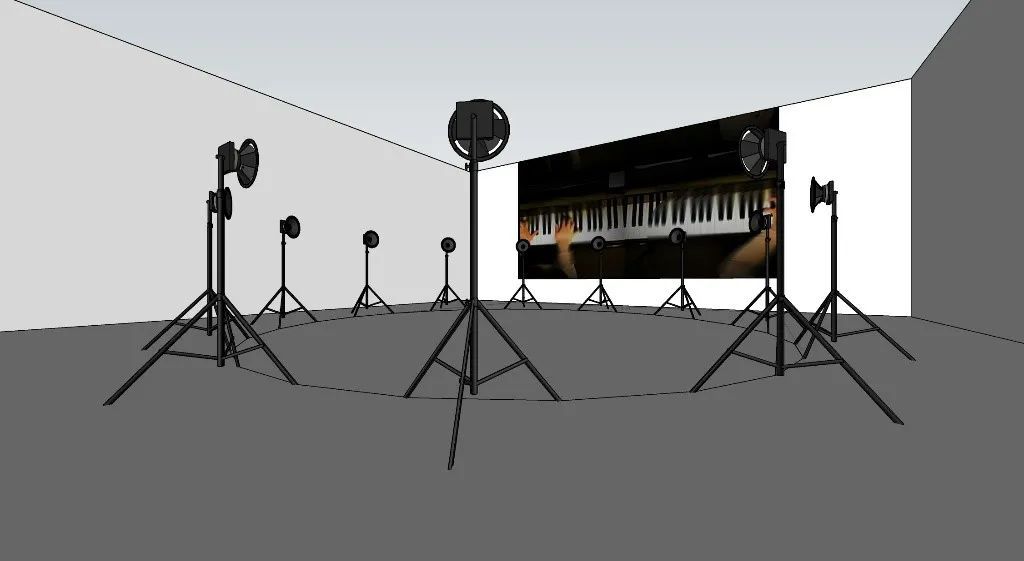 十二个独立于箱体之外的喇叭单元分布在一个直径7米的圆弧之上。他们以纯粹的象征性视觉去对话十二平均律和十二色光谱。其声、光运动方式将虚幻的音乐流动转变为一系列空间重构的视听运动。每一支发声单元如同一棵“音苗”,物理空间的观众与影像世界的演奏家相互感应,一同“浇灌”,使音乐“生长”。音乐原作得以在有限的时空关系中无限演化,进而催生出一道奇幻的新媒体“声态”,将各中声光物灵叠置与包裹。该装置在观念和物理实体上延伸了“作品”及“演奏”的疆域——实现了真正意义上的“三度创作”。