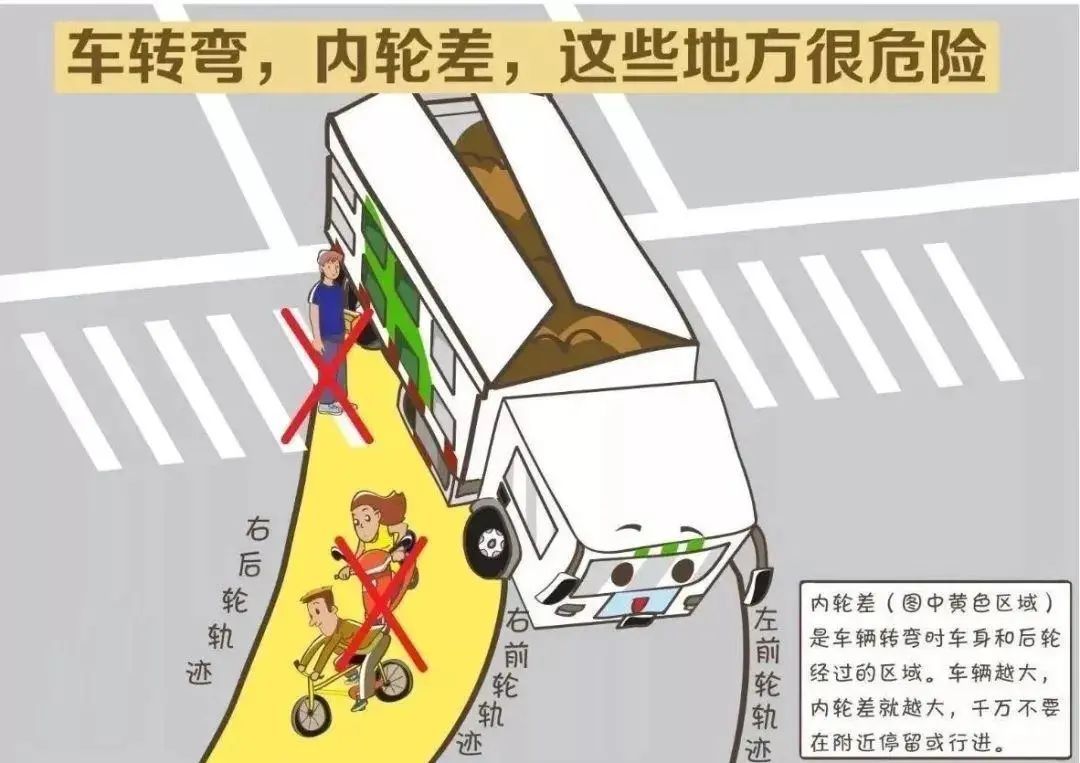 公交、大型货车等因车体较高,在靠近车体的下方存在更多盲区;又因车身较长,右转时形成较大的内轮差,扩大了视野盲区。所谓内轮差是车辆在转弯时,内前轮转弯半径与内后轮转弯半径之差,前后轮轨迹不完全重合,如下图所示。
