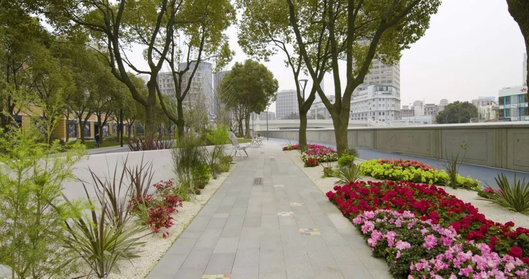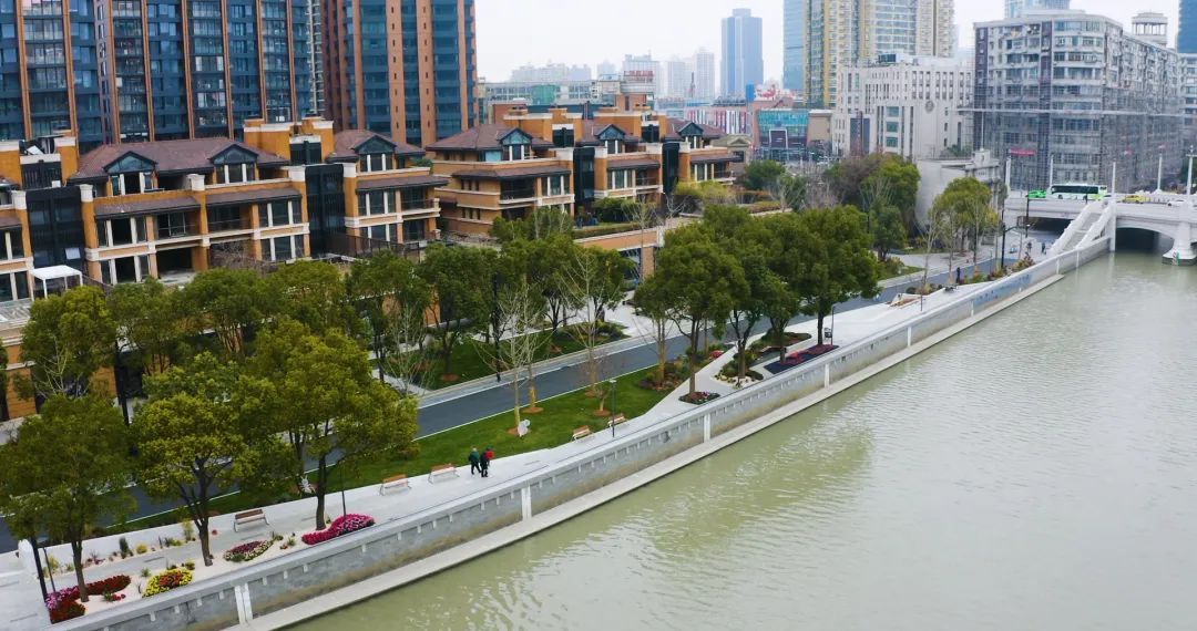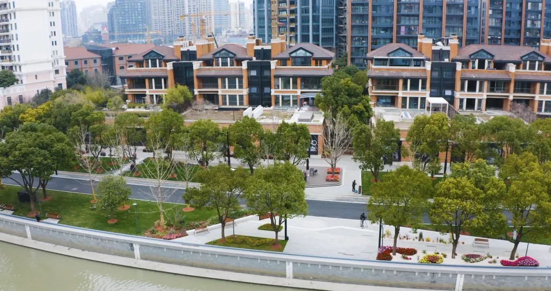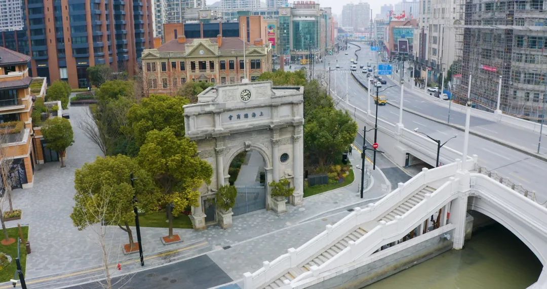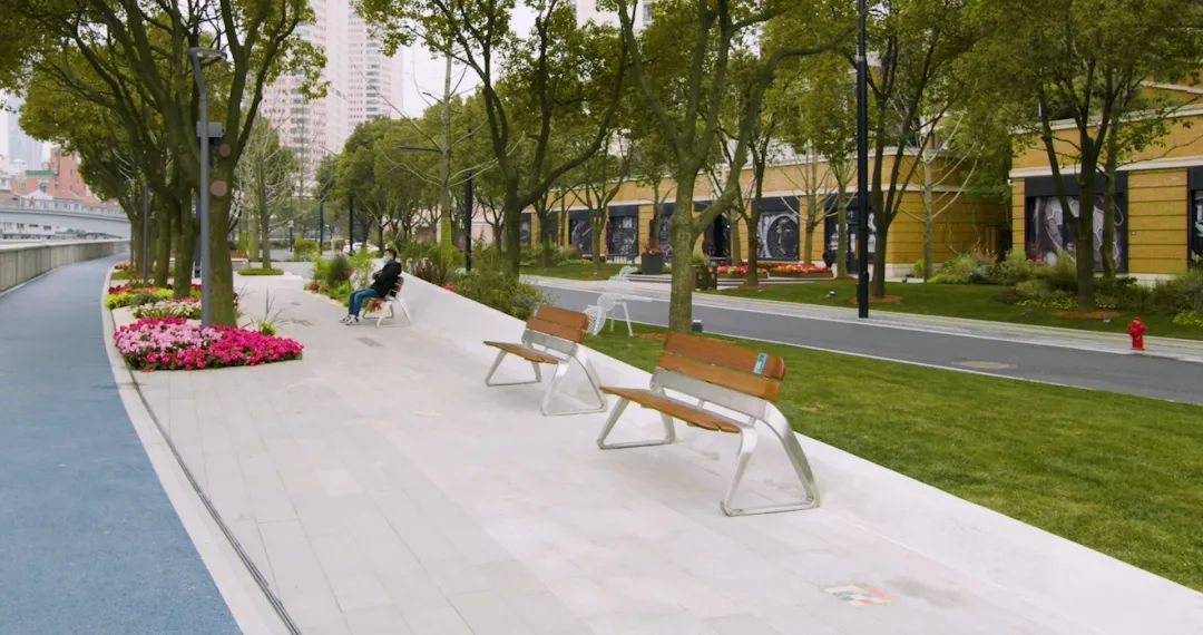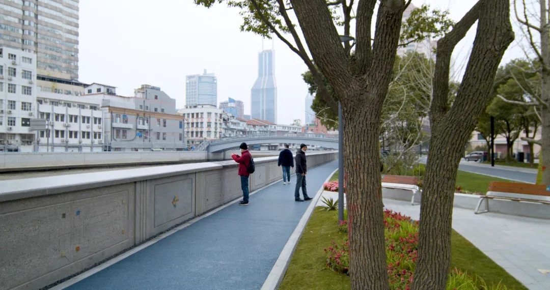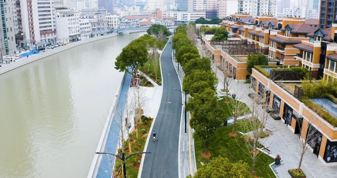 苏州河静安段其以优美的弧线,连接起福新面粉厂旧址、上海四行仓库抗战纪念馆、上海总商会旧址等历史地标,贯通工程以“阅读静安.诗话苏河”为设计理念,用人文生态景观承载市民幸福生活的温情岸线。