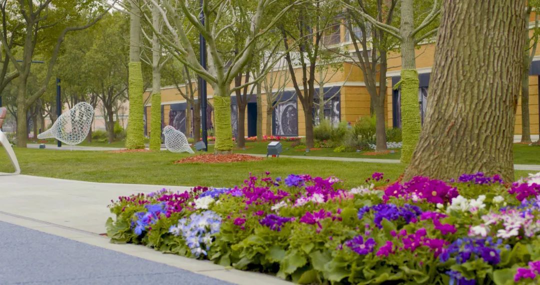 摩登花街位于华侨城地块门口,以共享式的花园街区为设计理念,结合滨河景观提升,共实施绿地面积约5600平方米,其中新增绿地约占50%;构建5排以银杏为主绿植,配置精致的草本花卉,突显银杏大道丰富的景观层次。