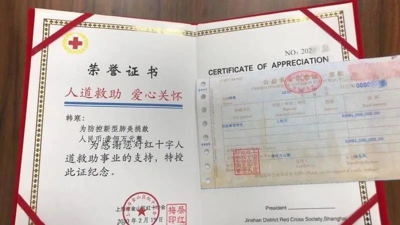 韩寒时刻挂念着家乡的疫情防控工作,他为家乡抗击疫情和医疗卫生建设捐助100万元,同时,在抗疫物资非常紧缺的情况下,他还想方设法从国外购买一台ecmo及医疗耗材,通过中华思源基金会捐赠至湖北抗疫一线,为需要帮助的病人带来希望。