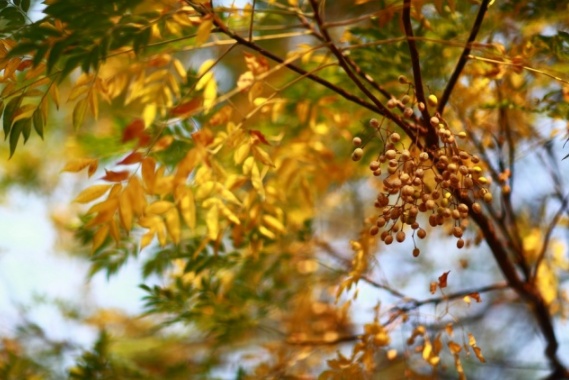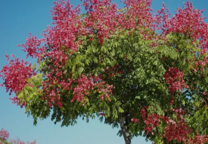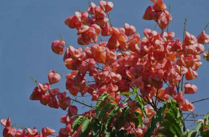 栾树,春季嫩叶多为红叶,夏季黄花满树,入秋叶色变黄,果实紫红,形似灯笼,十分美丽;栾树适应性强、季相明显,是理想的绿化、观叶树种。栾树为陈家镇“一镇一特色”的树种。