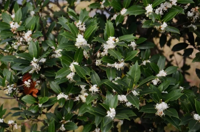 柊树整株感觉跟桂花很像,花也似桂花,所以别名“刺桂”。柊树花期11-12月,朵朵白色小花芬芳馥郁、沁人心脾,花香虽不似桂花浓郁和甜润,但在冬日里却有一番甘醇和清冽。柊树叶形多变,叶片在多刺到全缘间变化。
