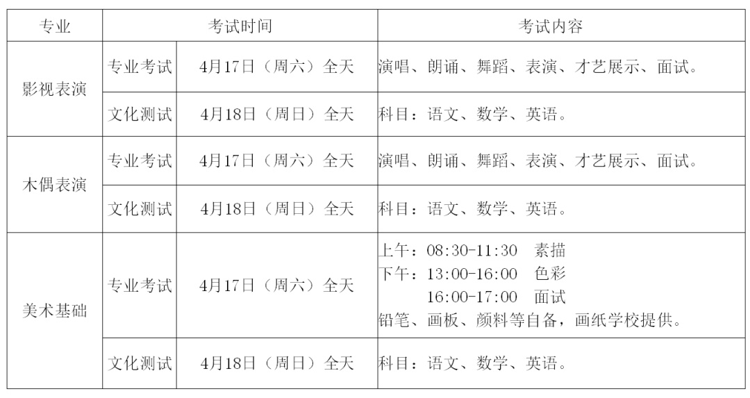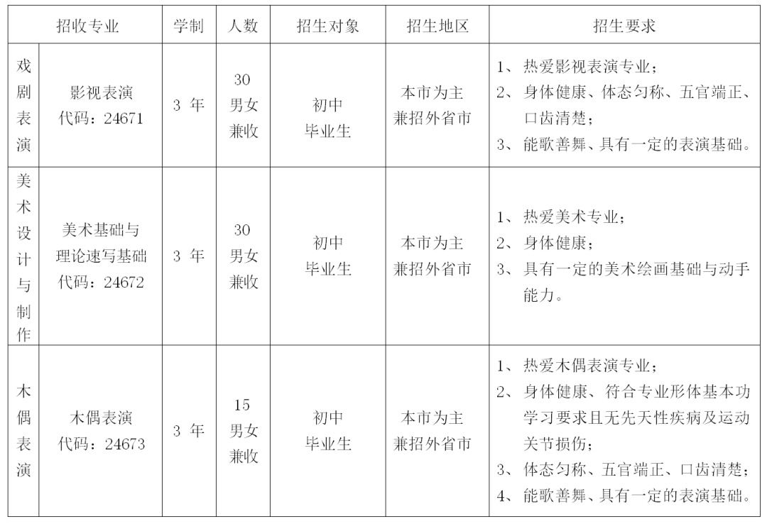 (一)报考影视表演、木偶表演、美术专业的考生,需参加中考:凡专业成绩合格的上海市生源初三应届考生第一志愿填报我校,优先录取。凡专业成绩合格的外省市初三应届毕业生,文化考试成绩(中考成绩)须经学籍所在地县级以上教育主管部门或招生办盖章认可,经上海市中招办同意,方能办理录取手续。