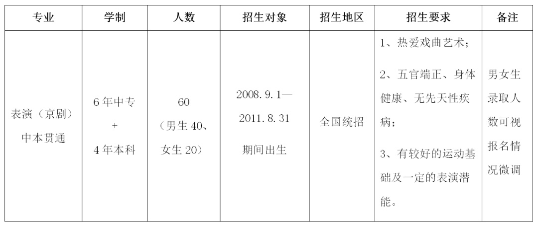 为进一步推动现代职业教育体系建设,促进戏曲艺术人才培养,经上海市教育委员会批准,2021年上海戏剧学院与上海戏剧学院附属戏曲学校合作,拟招收表演(京剧)中本贯通专业学生60人(男生40人、女生20人),学制十年(中专6年、本科4年)。