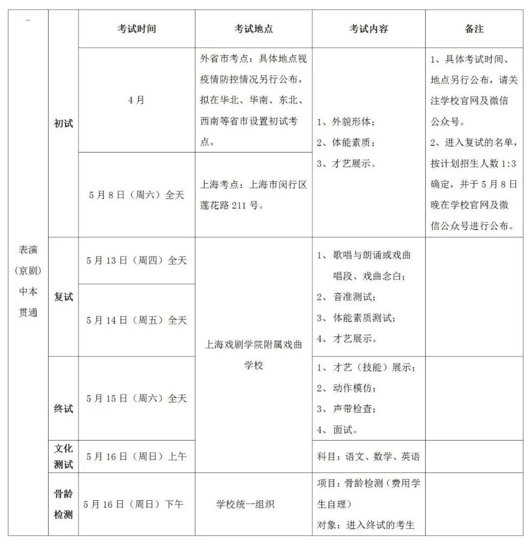 (六)2021年表演(京剧)中本贯通招生简章及招生细则请关注上海戏剧学院附属戏曲学校官网及微信公众号,获取《2021年上海戏剧学院附属戏曲学校—上海戏剧学院表演(京剧)中本贯通试点专业招生简章》。