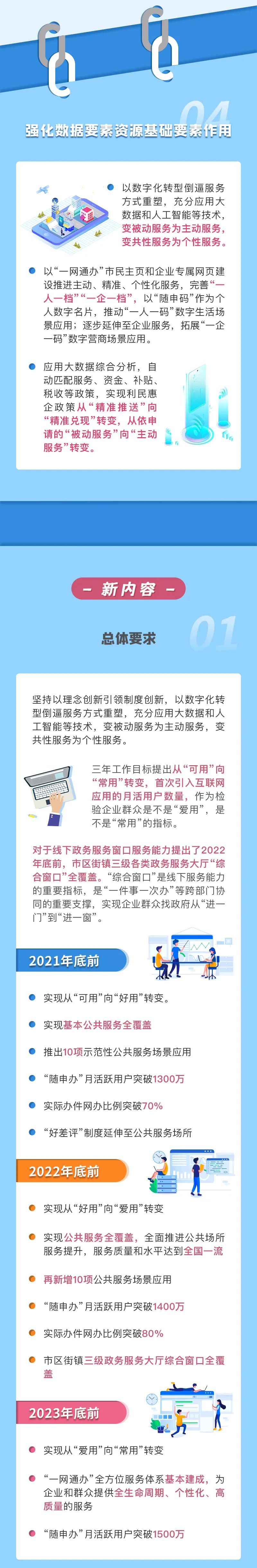 上海3月16日发布的《深化“一网通办”改革构建全方位服务体系的工作方案》明确,今年底前推出10项示范性公共服务场景应用、“随申办”月活跃用户数突破1300万、实际办件网办比例突破70%等;2022年底前再新增10项公共服务场景应用、“随申办”月活跃用户数突破1400万、实际办件网办比例突破80%、市区街镇三级政务服务大厅综合窗口全覆盖等;2023年底前“一网通办”全方位服务体系基本建成、“随申办”月活跃用户突破1500万等。