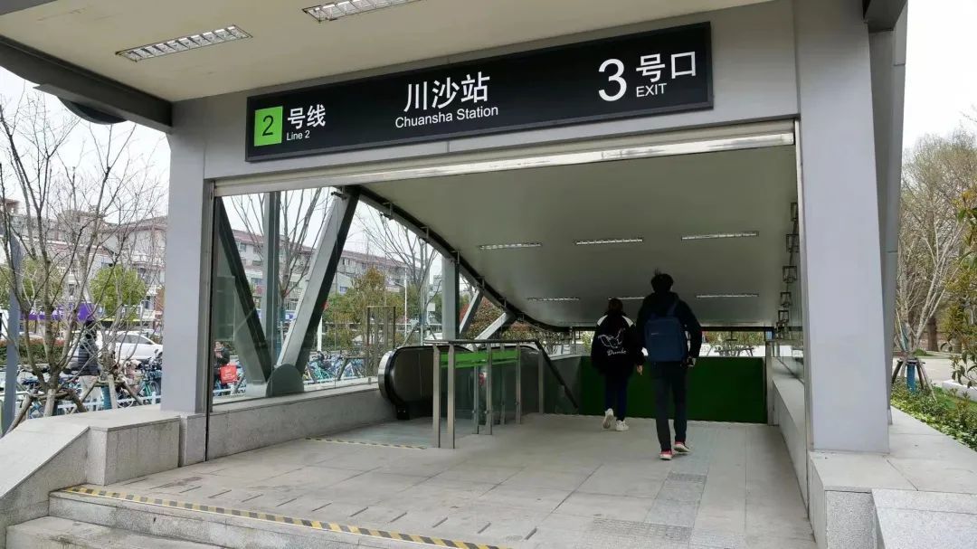 2号线川沙站位于川沙路和川环南路交叉口西侧,近几年随着周边区域的发展,居民区、商业圈等不断增加,客流也呈上升趋势,早高峰客流量已达1.5万人次左右,原本的1号口和2号口进站通行压力加大。为此,车站启用了3号口。至此,川沙站的3个出入口全部启用。