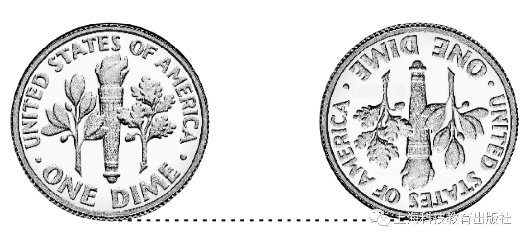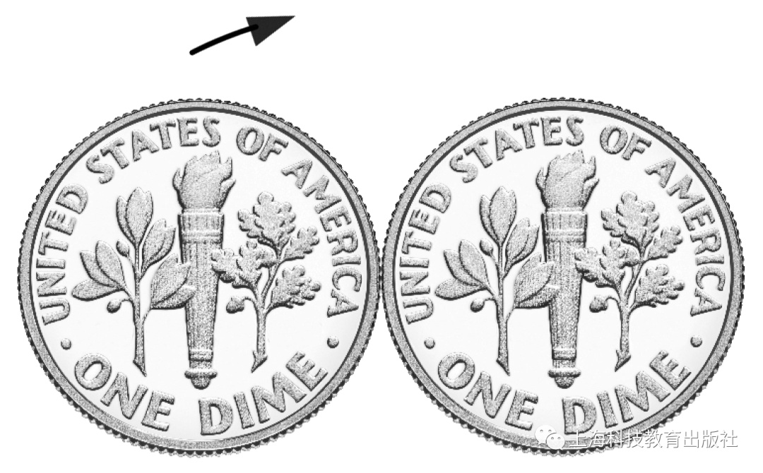 我们把两枚同样的硬币紧挨着放在一起,让硬币最初的方向保持一致。将左边的硬币沿着右边硬币的边缘顺时针滚动到其右侧,此时经过滚动的那枚硬币方向是怎样的?与原先一致还是上下颠倒?