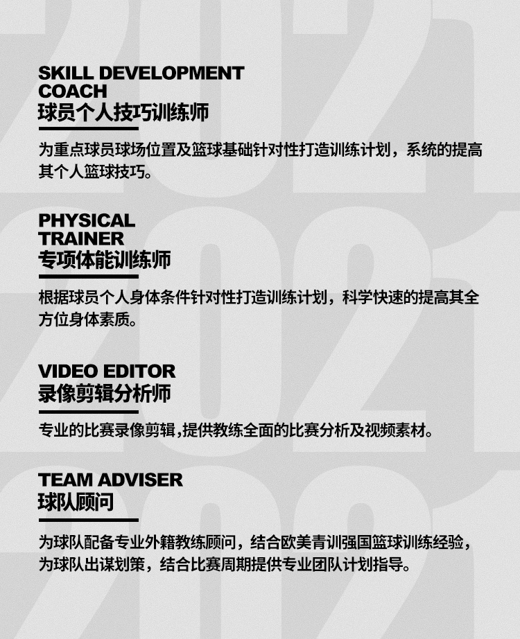 球员个人发展计划:将阶段性地为每位球员提供个人训练报告,客观评价该阶段训练进展及下一阶段的训练目标和计划;我们还将为入选的球员建立一份完善的球员档案,球员档案将包含球员详细的个人数据、比赛数据、比赛高光集锦等。