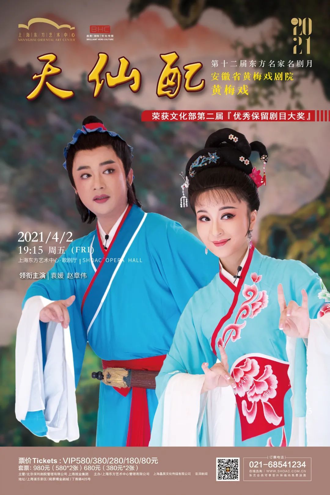 4月率先登场的名团安徽省黄梅戏剧院将以精彩阵容、经典名作“重装上阵”——袁媛、赵章伟领衔主演、取材自中国传统民间故事、曾荣获文化部第二届“优秀保留剧目大奖”的黄梅戏《天仙配》。