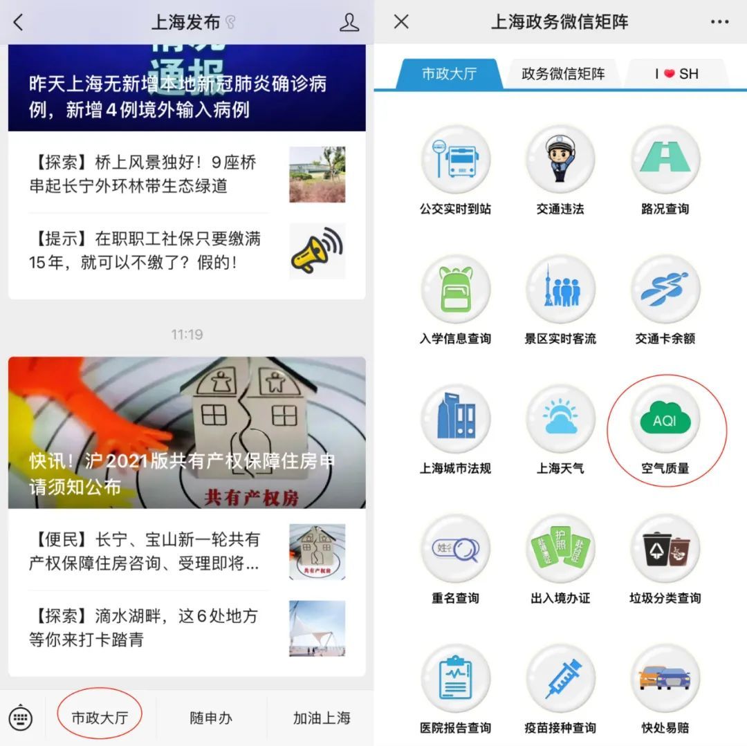 点击上海发布微信对话框,进入市政大厅,点击空气质量。