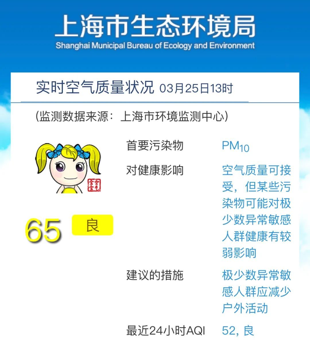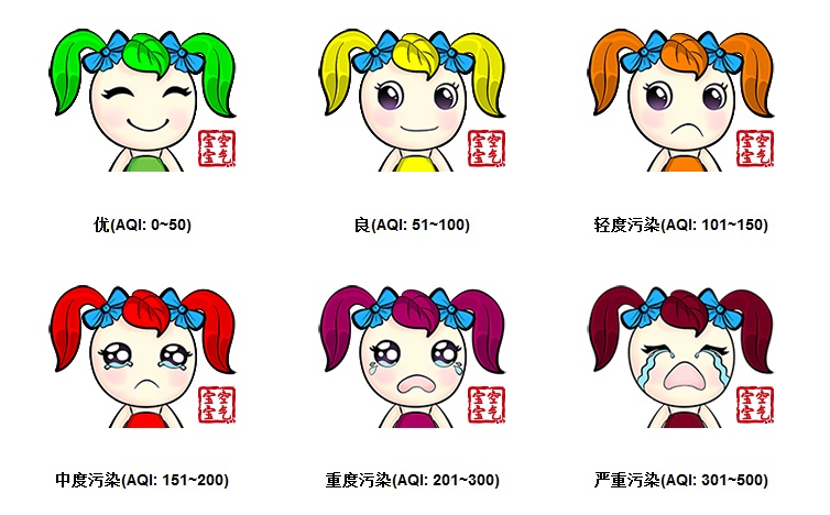 上海市空气质量形象代言人“空气宝宝”的表情和发色可直观表征当前实况的空气质量等级。数据每小时会更新一次哦(每半点左右更新)。
