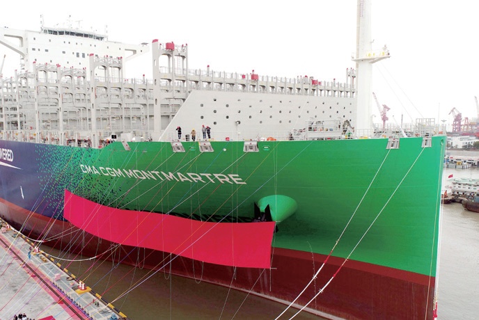 ▲2021年3月18日在江南造船交付点的23000teu超大型双燃料集装箱船“达飞蒙马特”号
