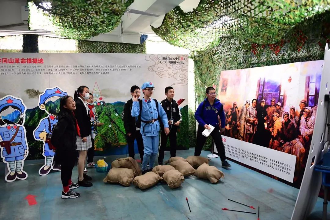 在“百年上海”游园会活动中,每个班级围绕上海城市精神的主题,把教室装扮成不一样的“乐园”。在操场上,记者就听到学生们在讨论一间“革命的教室”——七(4)班。跟着学生的脚步,记者来到了七(4)班。整个教室被装扮成了绿色军营的模样,在“南湖红船”环节,学生们可以以“摇橹”的方式体验当年革命先辈们在南湖上召开会议的艰辛和不易;再带上vr眼镜,就能亲临“一大会址”,来一场“红色之旅”。此外,志愿者们还设计了各种游戏,让学生们以游戏的形式来了解飞夺泸定桥、井冈山会议、遵义会议等革命事件......班主任林青霞介绍说:“作为共产主义事业的接班人,我们要传承并发扬红色精神,做一个合格的薪火传承者。”因此,本次班级游园的主题就是“一眼就留在心中的红”,通过沉浸式的体验,让前来参与的学生体验建党100周年历程中几个关键性的历史事件。