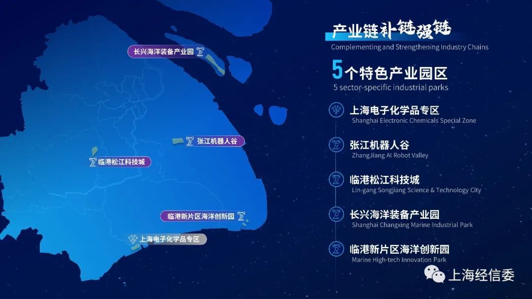 聚焦产业链补链强链,推介特色产业园区5个。其中,电子化学品专区,重点布局光刻胶、电子特气和湿电子化学品三大类产品,建设研发试验和生产基地。张江机器人谷重点发展特色工业、智能服务机器人,推动关键零部件、核心控制软件等攻关突破。同步推出临港松江科技城、长兴海洋装备产业园、临港新片区海洋创新园等园区。