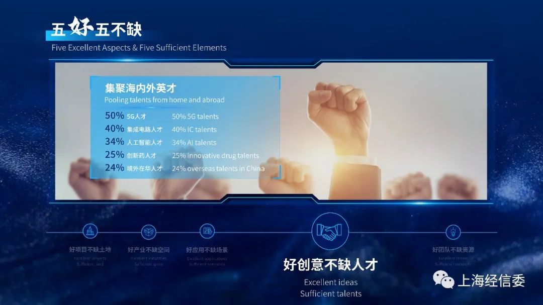 “好创意不缺人才”。上海拥有全国50%的5g人才,40%的集成电路人才,34%的人工智能人才,25%的创新药人才,24%的境外在华人才。接下来,上海将加快落实人才新政“20条”,大力引进和集聚海内外英才,加大重点产业人才奖励力度。