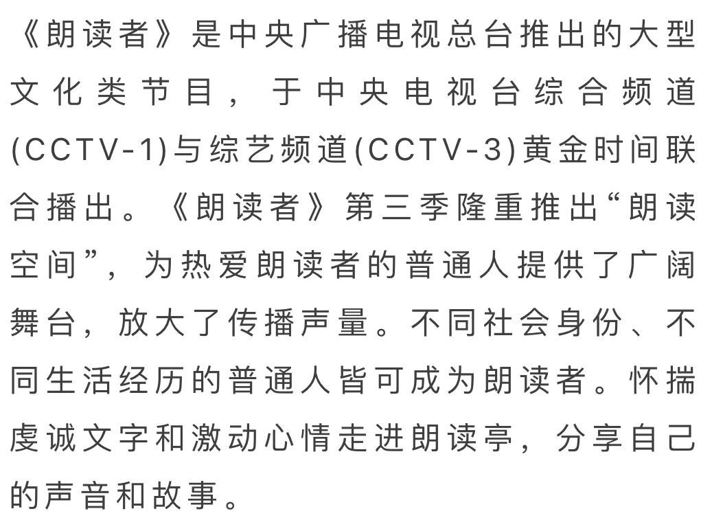 2、进入朗读亭后,先做自我介绍:我是朗读者xxx(名字),来自xxx(家乡、职业、生活城市均可)。