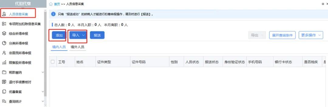 步骤二:采集专项附加 点击【专项附加扣除信息采集】→【添加】/【导入】后点击【报送】,员工自行采集的,可点击【下载更新】;