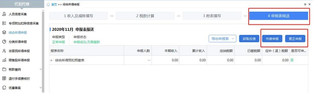 可点击【首页】,选择要更正的【税款所属月份】→【综合所得申报】/【分类所得】/【非居民所得】→【申报表报送】→【更正申报】,启动更正后就可以修改数据重新申报了,之后返回【收入及减除填写】界面修改数据,再进行【税款计算】,修改后全员全额重新申报。