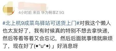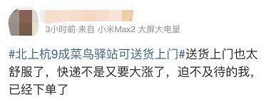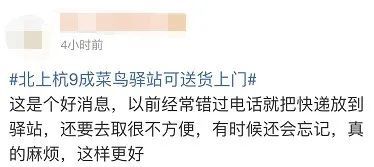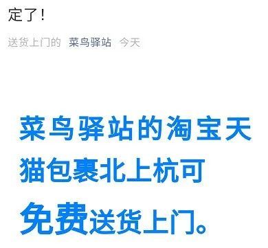 目前在北上杭三城,90%以上的菜鸟驿站站点完成了服务开通。消费者可通过登陆手机淘宝app,点击查看商品物流详情选择“需要上门”。在派送时效上,于当日15点前选择上门的包裹可当天送达,当日15点后下单的包裹将于次日送达。
