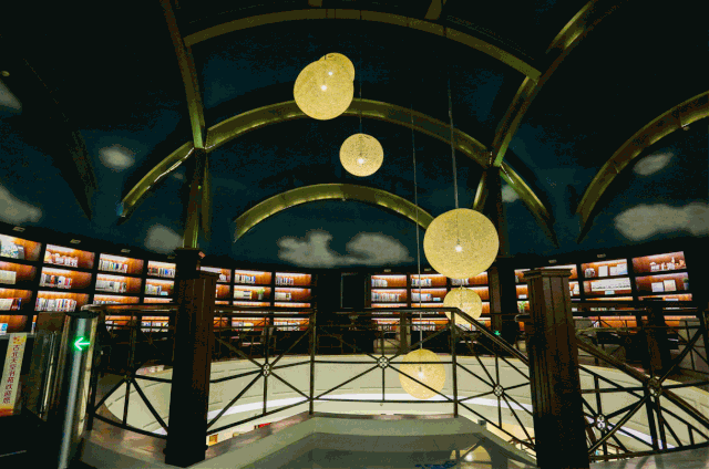 白色沙发、复古台灯、木质书架……极富设计感的悬浮楼梯将空间的错落感诠释到了极致。拾级而上,一座精致的圆弧造型图书馆呈现在眼前,屋顶及四周墙壁绘有蓝天白云,空气中流淌着静谧。
