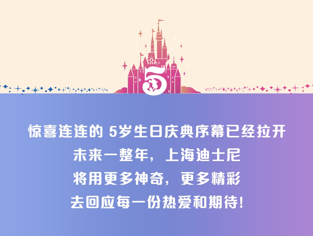 4月8日,上海迪士尼度假区五周岁生日庆典 正式揭开帷幕焕然一新的乐园、全新升级的花车巡游、令人叹为观止的“奇梦之光幻影秀”,还有遍布园区的层层惊喜,与游客们一起共同庆祝这一难忘的里程碑。