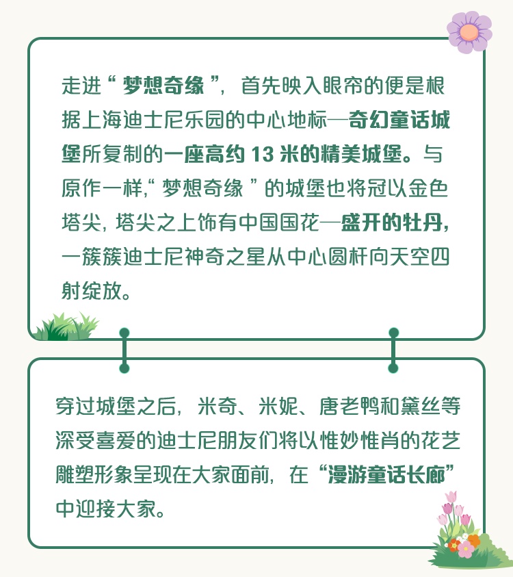 你知道吗,花博园里有一个“梦想奇缘”展园,里面有一座根据奇幻童话城堡复制的13米高城堡,还有米奇米妮、唐老鸭和黛丝等动画人物以花艺雕塑形象呈现在“漫游童话长廊”。效果图如下↓