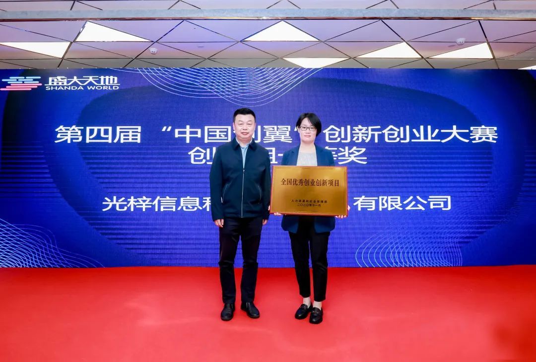 浦东新区人社局副局长张涛为第四届“中国创翼”创新创业大赛创业组一等奖光梓信息科技(上海)有限公司进行颁奖。