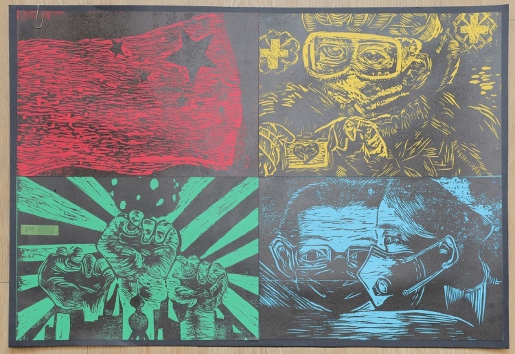 其中少儿组第一名作品《中国力量》,以版画形式描绘了四个画面,分别是国旗、众志成城的手势、戴着护目镜的志愿者及戴着口罩的医务人员。“这个作品既体现了选手的绘画技巧,内容又与抗疫相结合,很有深度。”龙念南说。